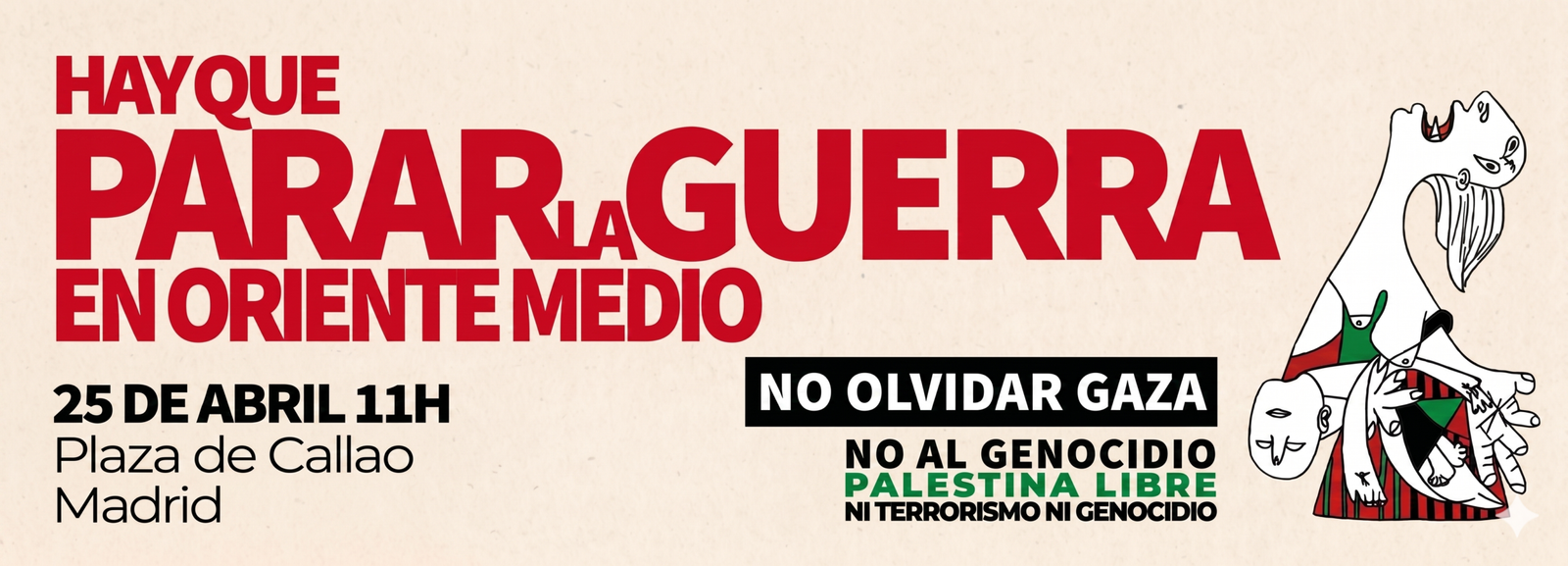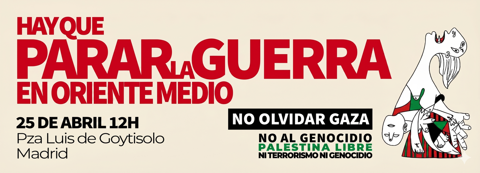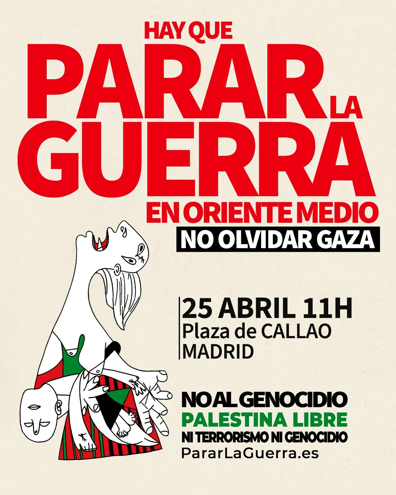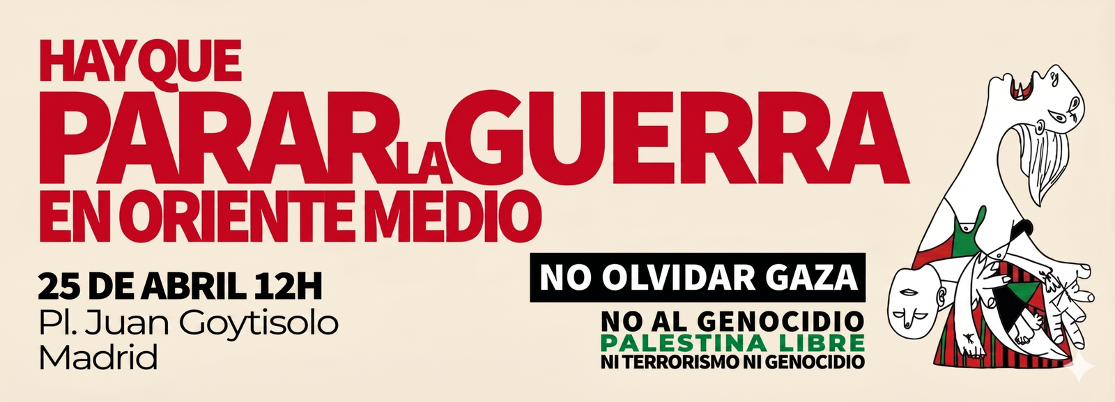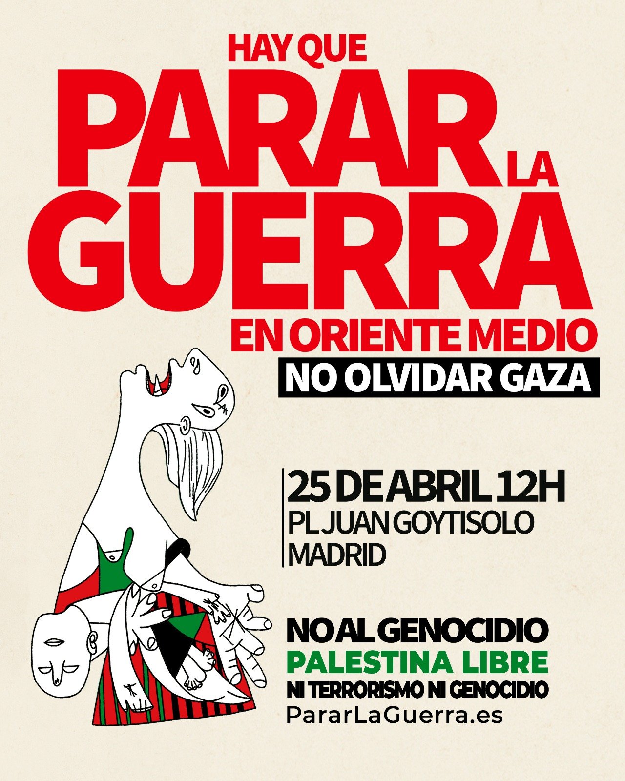El 12 de marzo de 2026 PararLaGuerra.es publica el primer manifiesto ‘Hay que Parar la Guerra en Oriente Medio. No Olvidar Gaza’, con 1537 firmantes, 204 personalidades y 143 organizaciones. La plataforma nació el 29 de octubre de 2023, denunciando el Genocidio en Palestina, para lo que ha publicado 8 manifiesto y convocado 7 movilizaciones estatales.