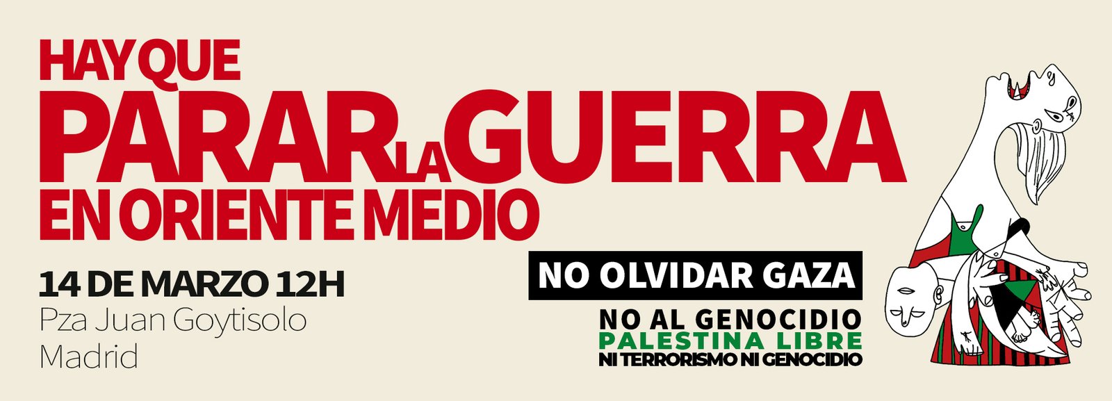 El 12 de marzo de 2026 PararLaGuerra.es publica el primer manifiesto ‘Hay que Parar la Guerra en Oriente Medio. No Olvidar Gaza’, con 1537 firmantes, 204 personalidades y 143 organizaciones. La plataforma nació el 29 de octubre de 2023, denunciando el Genocidio en Palestina, para lo que ha publicado 8 manifiesto y convocado 7 movilizaciones estatales.